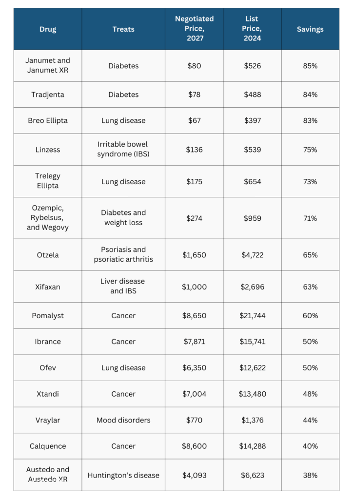 CMS has targeted the drugs that will yield the most savings possible to the federal government and Medicare Part D beneficiaries. They range from treatments for psoriasis, diabetes, and obesity to medicines for cancer, irritable bowel syndrome, and asthma. You can see a complete list in the table below, which includes the name of each drug, its negotiated price Medicare Part D will pay in 2027, its list price from 2024, and expected savings.
