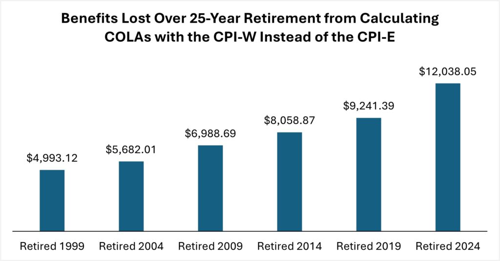 The cost of using the wrong price index is rising for seniors over time. As shown in the figure below, TSCL’s analysis predicts that, if current long-term inflation patterns continue, the average person who retired in 2014 will lose about $8,000 of benefits across a 25-year retirement from using COLAs calculated with the CPI-W instead of the CPI-E. For someone who retired in 2024, we project that number to rise to just over $12,000.