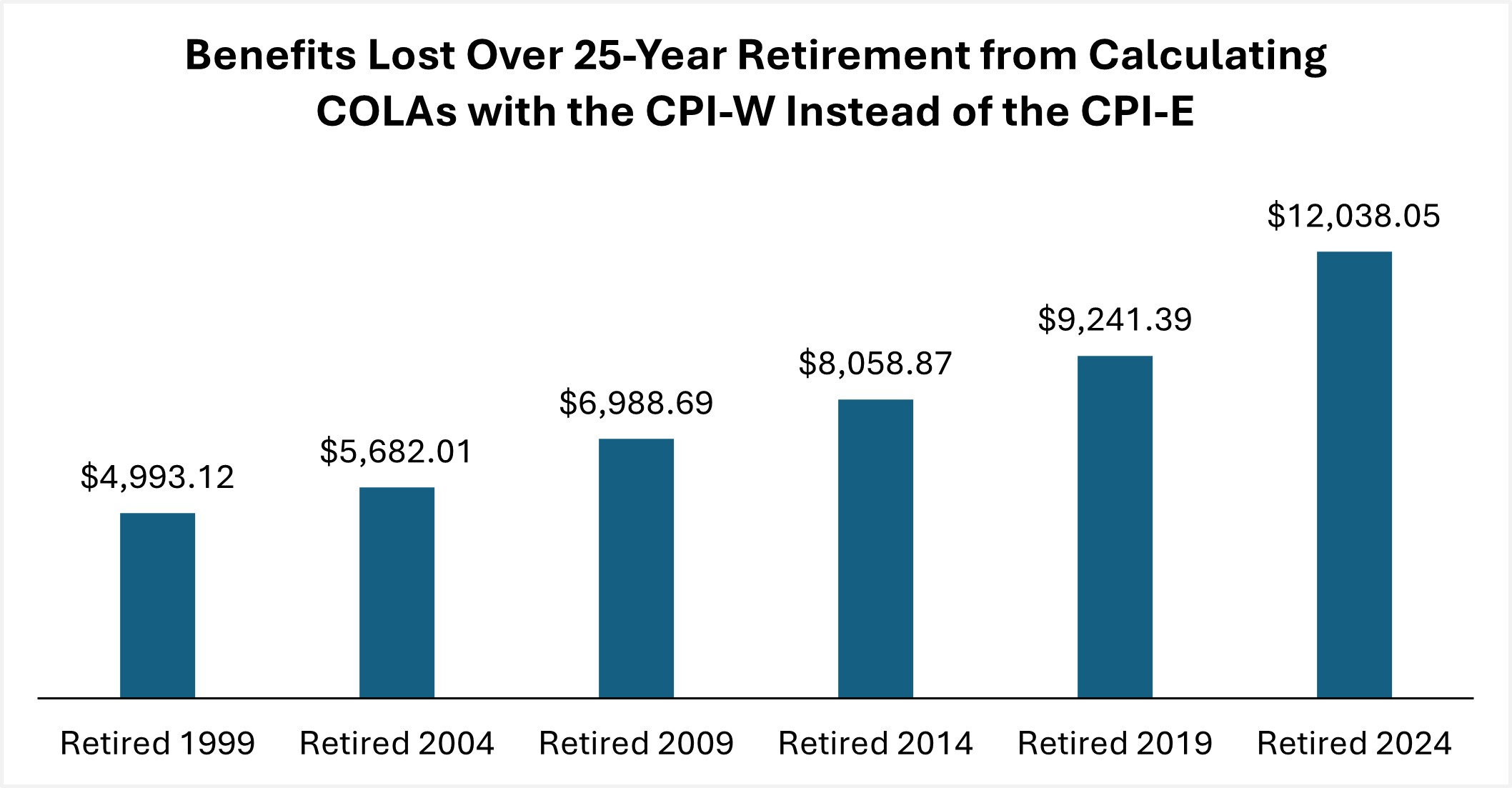 TSCL then calculated the total earnings from Social Security, using both the CPI-E and the CPI-W for each year by multiplying the expected monthly income by 12. Next, after summing these figures to get estimated earnings across a 25-year retirement, TSCL took the difference between the 2024 and 1999 figures to calculate the estimated lost income from using the CPI-W.