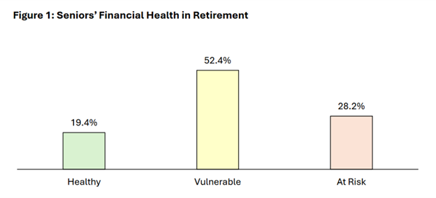 As shown in the figure below, only one in five older Americans (19.4 percent) describe themselves as financially healthy in retirement, defined as having adequate income that will last through retirement, as long as they live. Meanwhile, 52.4 percent describe themselves as financially vulnerable, with enough income to get by for now, but doubts about the future. Most concerning of all, the remaining 28.2 percent categorized themselves as financially at risk, with too little income to cover even essentials.
